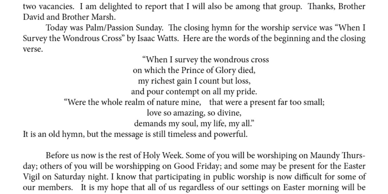 Since I retired for the fourth time in September of 2018, it was quite unusual that I was preaching on the Sundays of Holy Week and also on the Second Sunday after Easter. Then I remembered that during the last Advent and Christmas, I was also active for four Sundays.